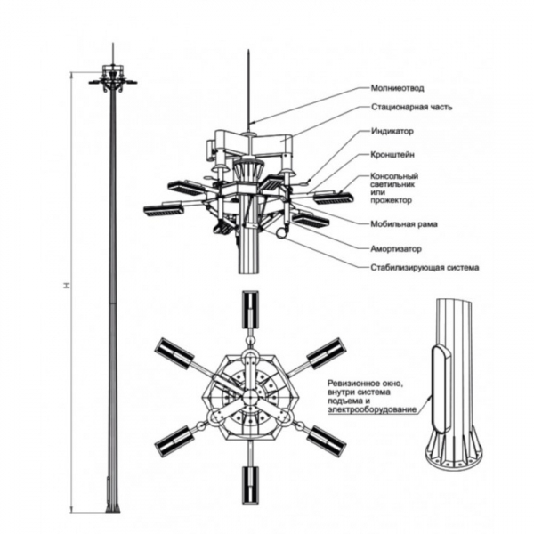 Высота высокомачтовых опор МГФ 25 метров. Их грузоподъёмность составляет до 800 кг. Количество прожекторов в каждой опоре — до 12 штук.